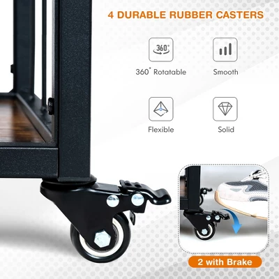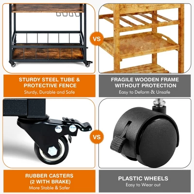 - Portable Design & Extra Storage: The cart is built on 4 casters to achieve smooth movement. With 2 brakes, the cart will stand stably when stopped. Meanwhile, the cart is equipped with a wine rack for 4 bottles and a goblet holder for added storage. There are 4 hooks on the side of top tray, to help you hang the towel and others.