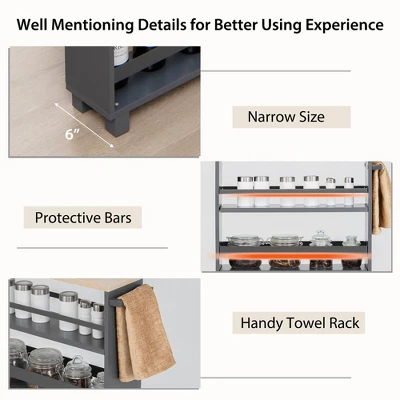 - tier Shelf for Storage and Display: The slim storage cart features a countertop and 3-tier storage shelf with different heights to classify and store kitchen supplies, helping you keep a neat kitchen environment. Besides, the first shelf with 2-position adjustable heights allows you to customize storage space with great convenience.