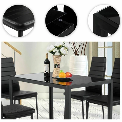 - Delicate Design: This Giantex kitchen dining set includes one tempered glass top table and 4 PVC leather chairs which makes it looks fantastic in any dining room. There is no doubt to say that such an elegant addition and suit any decor style dining room with the black colors.