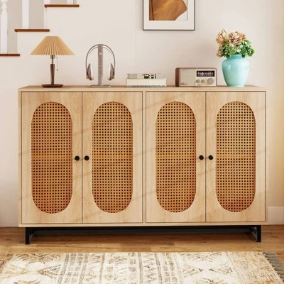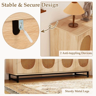 Our large buffet sideboard offers 2 roomy compartments with 4 doors and 2 adjustable shelves, letting you customize storage for anything from coffee supplies, books, to random-sized shoes. The sturdy panels and metal legs supports a heavy load, while anti-toppling devices keep it securely anchored. With its woven rattan doors, it works beautifully as a kitchen cabinet, coffee bar, or entryway organizer, bringing a touch of boho charm to your living space. Enhance your storage with style today!