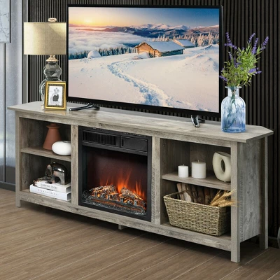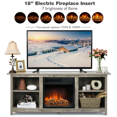 - Are you looking for a TV stand with an electric fireplace? Our TV stand might be a good choice for you. The electric fireplace heater has a stable frame, which can be used for long time. Comes with 2 heating settings (750w/1500w), the fireplace can reach the goal of both warm and energy saving. The realistic fire-like electric fireplace with life-like logs consists of flame with 7 different variations of brightness, creating a life-like flame feel. It is easy to operate with remote control or panel. And the TV stand has four compartments for storing audio video component equipment. The concise design makes the TV stand an ideal ornamentation to match your home and infuses rich aesthetics and elevated style into your room. Just enjoy the warmth when you watch TV with your family members!