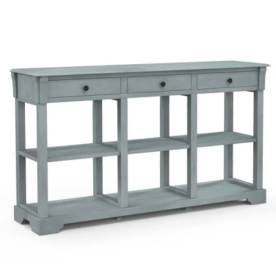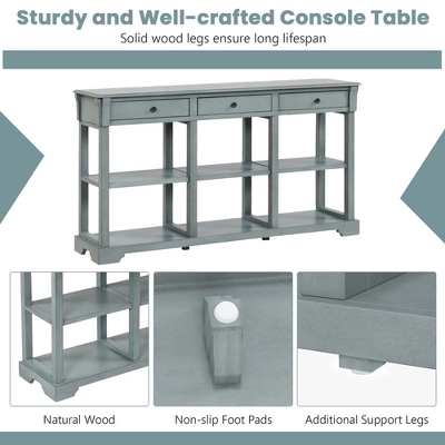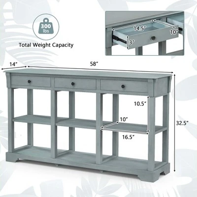 A console table that combines strong sense of vintage design and classicism beautiful shape takes you back to the 20th century early times. To meet diversifying storage demands, our sofa table comes with a wide tabletop, 3 drawers and 2-tier open shelf to keep decorative items and daily supplies in order. In addition, natural wood plus exquisite craftsmanship makes the console stand out from others. Solid wood legs mean better durability, longer life span and higher sturdiness. More, anti-toppling device takes the stability to a higher level. All in all, the multipurpose long sofa table is a reliable addition to your living room or entryway.