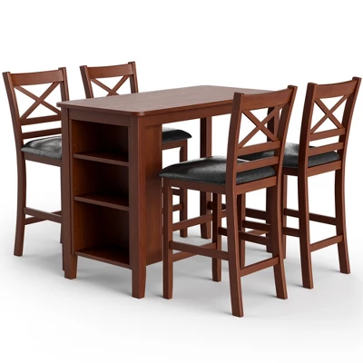 The 5 pieces bar table set is a perfect complement to your home, which can comfortably seat 4 people around the table. The smooth MDF tabletop not only provides enough space for food and drinks, but also ensures easy cleanup. Moreover, 3-tier shelves can well suit your storage needs. The bar chairs come with padded seat and ergonomically shaped backrest for comfort. With antique style and elegant appearance, it is an perfect addition to your kitchen, dining room, restaurant, etc. In a word, this bar table set provides a good gathering place for you and your family.