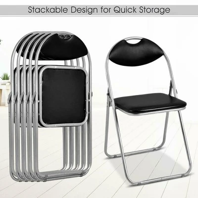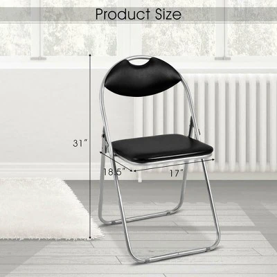 Color: blackMaterial: iron(tube)+PVC(back and seat)Weight capacity: 250lbs.Weight of each chair: 8.2lbsOverall Size of each chair: 17 2/5”x18 1/2”x31 1/5”Package include: 6 x folding chairs