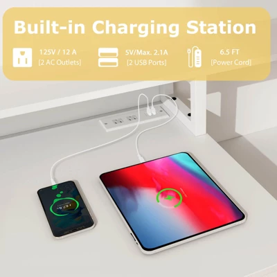 - Built-in Charging Station: The computer desk is built with 2 AC outlets (125V/12A) and 2 USB ports (5V/Max. 2.1A) for your phone, headset, tablet, and power bank with fast charging. Besides, the 6.5ft long power cord allows for greater freedom in arranging and setting up the desk.