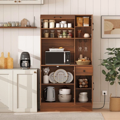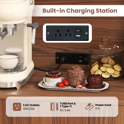 - Integrated Charging Station: This pantry cabinet features a built-in charging station that is easy to charge microwave, coffee maker and other appliances. There are 2 outlets, 1 USB port, and 1 type-C port to keep electronics powered up and within reach.