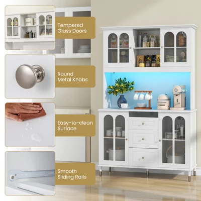 - Sufficient Storage Space: Featuring 4 cabinets, an open compartment, and a spacious countertop, our kitchen pantry cabinet provides ample storage to accommodate all your kitchen essentials. All the shelves are height adjustable, and the arch-shaped tempered glass doors keep your items neat and visible.