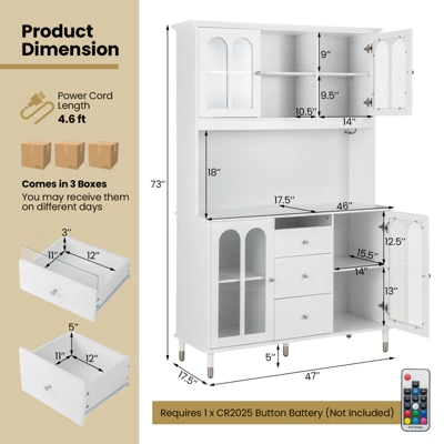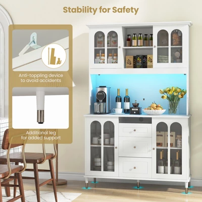 Optimize your kitchen storage and cooking mood with our kitchen pantry cabinet!From small kitchenware to large boxes, every item will find its place within its drawers and compartments with adjustable shelves. The generously sized countertop, completed with a built-in power outlet, keeps your electric appliances ready at your convenience. Need to set up the mood for parties or to your liking? The dynamic LED lights offer a spectrum of color, brightness and mode options. For your peace of mind, stability is guaranteed by the anti-toppling devices and the additional support leg. Its sleek modern design and arch-shaped window panes adds a touch of elegance to your dining spaces, balancing functionality and style.