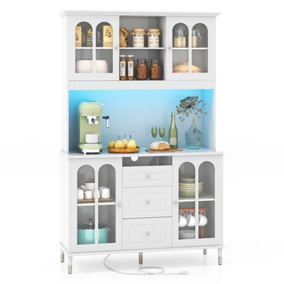 - Dynamic LED Lights: Grab the remote control and create a personalized ambiance in your kitchen. The LED lights of our kitchen storage hutch feature 21 dynamic modes, 20 static colors, and 8-level adjustable brightness and shifting speed, for you set the perfect lighting for any occasion.