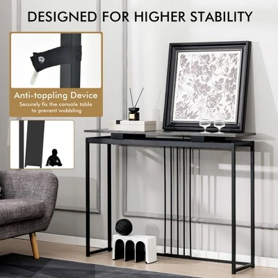 - High Reliable Structure: The MDF tabletop makes it durable enough to serve for a long time. Also, supported by powder-coated steel frame, the narrow entryway table is not easy to shake or deform, which can bear up to 44 lbs. Additionally, the sofa table can be fixed with anti-toppling device in case of any wobbling or collapsing due to collision.