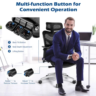 Are you looking for a multifunctional office chair to relieve spine fatigue and improve your work efficiency? Equipped with adjustable headrest, 3D armrest and weight-activated lumbar support, the high back office chair supports your arms, neck and waist in most comfortable position to ease your fatigue. Also, you can change the seat height, back angle and seat depth by operating the sided multi-function buttons . Unlike the ordinary design seen in the market, the advanced system is supposed to bring much more convenience during your daily life. The backrest can be independently adjusted to meet different needs of people. What’s more, the mesh back and seat keep the air flow for a cool and comfortable sitting feeling. You can move it on any floor due to the smooth rolling casters, which causes lower noise as well thanks to its mute design.