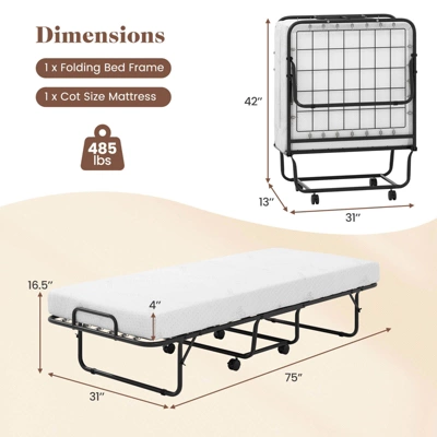 Ready to transform any room into a cozy guest bedroom in a snap? Discover the ultimate solution to space and comfort with this luxurious folding rollaway bed. Equipped with a deluxe 4-inch memory foam mattress and sturdy construction designed to support up to 485 lbs, this rolling bed ensures your guests enjoy a splendid night’s sleep. Its compact and easy-fold design, complete with fix straps and mattress retainers, makes it ideal for stashing away in small spaces or for travel. Not to forget, the bed glides effortlessly on smooth-rolling casters that lock into place for secure placement. Setting it up is a breeze, thanks to its pre-assembled parts! Ideal for those who value comfort without compromise, it’s perfect for homes, offices, and dorms. Give your guests the gift of ultimate comfort – bring it home today to redefine sleepover experiences!