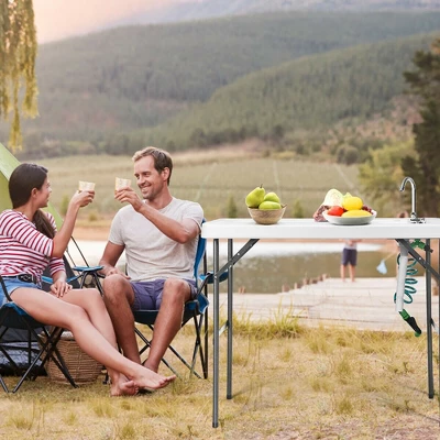 This deluxe clean table provides a portable, sturdy, & efficient work area for all your outdoor needs, from clean fish & small game to potting plants. The quick-connect faucet is simple to set up & attach to a garden hose, & the extending sprayer gives you water pressure where you need it. With a durable sloped surface & integrated sink with drain, this table gives you the convenience of your kitchen in the great outdoors. The folding legs allow you to take this table anywhere, & easily store it when your work is done