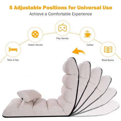 Our beige folding lazy sofa chair provide a extreme feeling in your leisure time. With the folding Are you looking for a practical sofa for your leisure time. This is our functional folding lazy sofa that will give you excellent relaxing time. In order to achieve your multiple demands, this chair is featured with 5 adjustable position. If you feel tired, you can transform the position into streamline to take a nap. While you want to watch movies or read books, the backrest will support your back perfectly. In addition, the combination of thick padded sponge cushion and faux suede cover with decent touch will bring you excellent using experience. This folding floor sofa will satisfy with your various requirements.