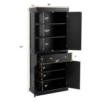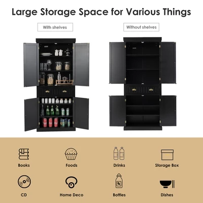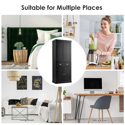 Are you finding a storage cabinet to make full use of space of your room? Our practical storage cabinet with large space can help you solve this problem. Not only can the cabinet be placed in kitchen as a cupboard, but also it is ideal to be a normal cabinet in your bedroom, living room and hallway to add a functional storage option. The storage cabinet has two double-door cabinets and one large center drawer which will provide spacious space for your items. And four shelves come with the cabinet that all can be detached or adjusted in three positions. In addition, the door is equipped with magnetic button to prevent items from falling and round handle for opening and closing easily. Its stylish design makes this cabinet match well with any other home furniture or decors.