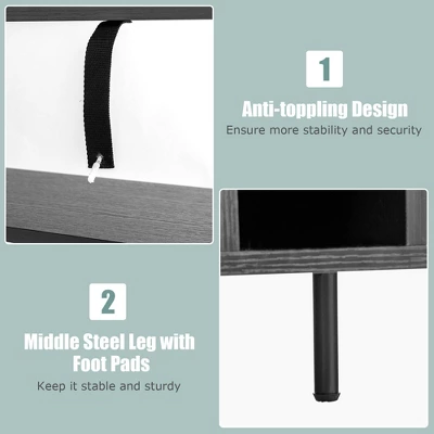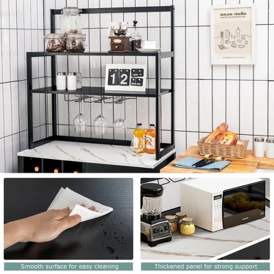Our kitchen baker’s rack is a good assistant for your kitchen and dining room.3-tier shelf, drawer and bottom open compartment offer sufficient storage. Wine glass rack can support 6 glasses, while wine rack can accommodate 18 wine bottles. It can be used as a wine rack, microwave stand, storage cabinet, baker’s rack and display shelving. Besides, engineered wood legs and middle steel legs keep it stable and sturdy. Anti-toppling system allows for higher security. In addition, it’s also designed with metal drawer handle and smooth slide rails.