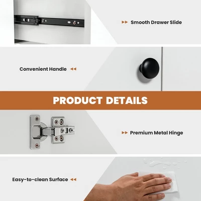 This white cabinet features a spacious top, 2 drawers and 2 compartments with doors, which offers ample space to meet the daily storage need. The smooth drawer slides let you pull in and out the drawers effortlessly. And all the doors and drawers are equipped with convenient handles. 2 adjustable shelves enable the cabinet to accommodate items of different sizes. With the anti-tipping design and floor type, this storage cabinet is super stable and safe for use. And constructed from high-quality boards, it is sturdy and long-lasting.