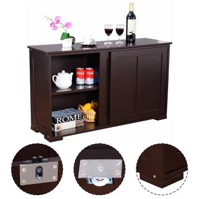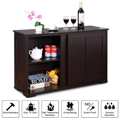 This is our kitchen storage cabinet, which is a perfect to fit your kitchen or dining room and provides you with a unmatched convenience. It features a big sliding doors storage cabinet for all your kitchen gadgets and tools, making it a tremendous value as well as a great space saver for your kitchen. Come with a spacious top, this cabinet is great for storage or display. Plus, the solid wood construction provides years of sturdy and reliable use. Host dinner parties and prepare great meals with this wonderful kitchen cabinet!