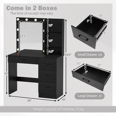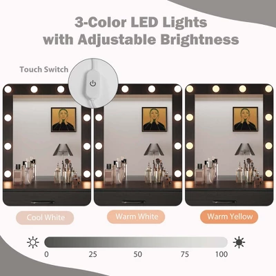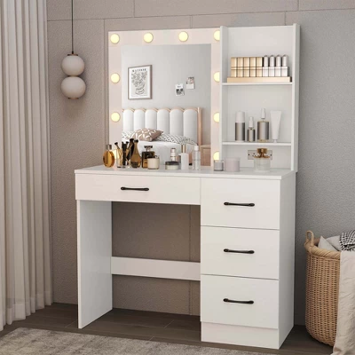 This makeup table features a built-in charging station with 1 USB ports, 1 Type-C port and 2 AC outlets for convenient device charging. The HD LED lighted mirror offers adjustable brightness and 3 color options to suit your needs. You can stay organized with ample storage including drawers and open shelves. This stylish and practical dressing table makes a perfect gift for loved ones on special occasions, combining functionality and elegance beautifully.