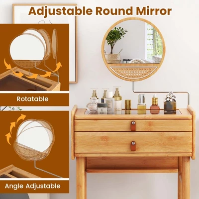 This vanity table comes with a removable mirror. You can adjust the angle of the mirror while putting on your makeup. The tempered glass tabletop makes it easy to find the cosmetics and skincare products you need to use. 2 pull-out drawers and a large tabletop provide plenty of space to store and organize all your beauty products. Moreover, this bamboo dresser is sturdily constructed. Reinforced bars and non-slip foot pads ensure extra stability. Perfect for a small bedroom or checkroom, this space-saving vanity table maximizes functionality without sacrificing space. It is not only a practical choice for your beauty routine, but also an ideal gift for your friends and family.
