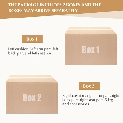 - Comfortable Sofa Couch: 105-degree backrest angle and ergonomic armrests bring you much comfort. On the other hand, 7” thick seat cushion is filled with soft sponge, which gives great support and helps you fully relax. And the 66”(L) x 19.5”(W) seating area can well hold you and your family at the same time. Tips: The package includes 2 boxes and the boxes may arrive separately. And box 2 contains the screw bag.