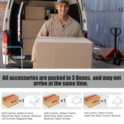- Shipped in 3 Boxes: This 3-seat sofa couch comes with 3 boxes, so that you may not receive all the packages at the same time. The detailed instruction can guide you step by step through the installation. Overall dimension of the sofa: 94.5” x 32.5” x 32.5” (L x W x H); weight capacity of each seat: 660 lbs.
