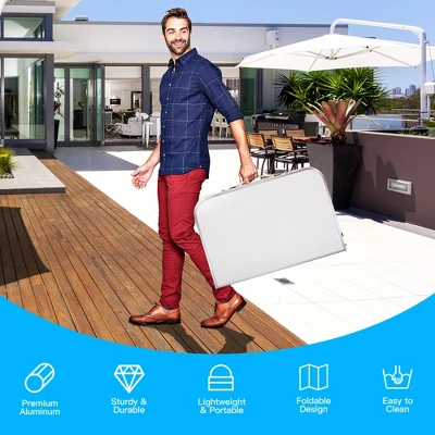 - [Selected Material for Durability] Constructed of heavy-duty aluminum frame, this folding table is not easy to crack and wobble for better use experience. The outstanding characteristics of solid density board make this table durable enough for long term use.