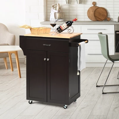 - Ample Storage Space for All: In lack of space to organize your messy kitchen wares? This kitchen island offers spacious storage space while being a serving cart for your dinner time. Large cabinet space helps store small appliance, pots, pans, etc. A shelf is for better classification. One drawer is suitable for utensils and dinnerware.
