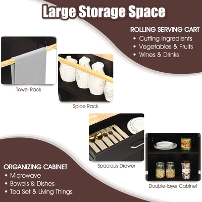 - Functional Serving Station: Such home accents with rustic wood tones and charming storage creates a warm and inviting look, making it perfect as a serving island in an entryway, dining room, living room, etc. Spice and towel rack on each side of the cart give more convenience to a great extent.