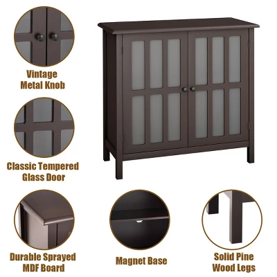 Functional storage cabinet has 2 tempered glass doors that open to two shelves for versatile storage