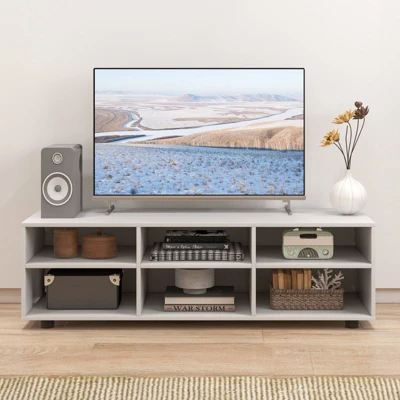 - Spacious Open Storage Space: The TV console table is designed with 6-cubby compartments with classified storage space and keep television, video player, books, CDs, vase, decorations organized. The upper wide tabletop is roomy enough to accommodate most flat screen TVs up to 55”. The open design is perfect for showcasing and easy fetching.