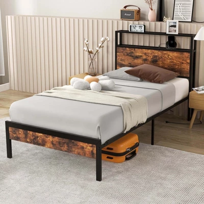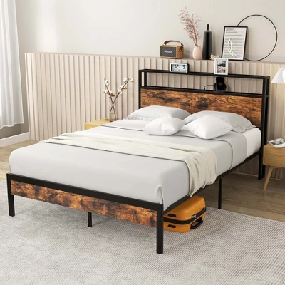 Sleep in style and stay organized with our platform bed with industrial headboard & footboard! Charge your devices in a flash with our lightning-speed 18W USB C port while you snooze. No more tangled cords or searching for outlets – our spacious 2-tier headboard offers convenient storage for your essentials, keeping your bedroom tidy and clutter-free. You can rest easy on the premium quality metal frame that guarantees stability and long-lasting durability. Say goodbye to creaky noises and uncomfortable nights with the metal slats and mute bar. Besides, there is a 10.5” clearance between bed and ground, allowing a sweeper to go through for easy cleaning. Upgrade your sleep experience with our cutting-edge platform bed. Get yours today!