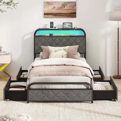 The LED lighting incorporated into the headboard creates a captivating glow and enhance the ambiance of your space. There are 60,000+ colors, dynamic modes, music mode and MIC mode for customized sleeping time. The brightness, flashing speed and timing function can be operated by remote or app control to create various scenes. Stay connected and charged with ease, thanks to the integrated charging station on this bed frame. Moreover, 4 storage drawers provide substantial space to store bed linens, clothing, etc. Upholstered in high-quality linen fabric, the bed frame adds elegance to your bedroom, while providing a comfortable backrest to lean against. Supported by heavy-duty metal slats, this platform bed boasts strong weight capacity. All in all, the modern LED bed frame is an eye-catching addition to any bedroom.