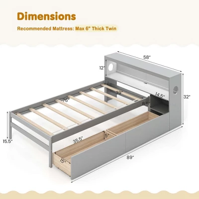 Maximize your kid’s bedroom’s potential with this stunning twin bed frame! Featuring a bookcase headboard incorporated with a 2-tier nightstand, it’s a dream for space-savers. Love reading at night? The built-in bright LED light provides a perfect, cozy glow, eliminating the need for extra lamps. Charge your gadgets right from your bed with the handy USB and Type-C outlets. Plus, declutter in style with 2 large, movable storage drawers—ideal for stashing away clothes or toys. Crafted from solid wood and reinforced with sturdy slats, this bed frame offers supreme durability without the bulk of a box spring. Upgrade your sleep experience and embrace elegance with this multifunctional bed designed for modern living!