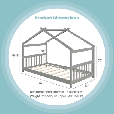 The house bed will give your children a space of their own. The funny house-shaped design adds an amusing touch to any bedroom, and your little one can decorate their favorite ribbons, tent or lanterns on the eaves. The lower bed is close enough to the floor that leaves you no worry about getting hurt. Besides, the headboard and footboard are comfortable to lean against. The house bed frame twin size is composed of solid wood frame and reliable wooden slats, providing exceptional stability and durability. This chic kids house bed will blend into the room of different styles, making up a high-quality and understated appearance.
