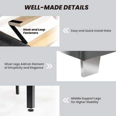 Still looking for a favored bed frame? Our upholstered bed meets your daily needs for both sleep and leisure. Supported by solid wooden slats, the bed base features outstanding toughness and bending resistance. The extra middle support legs with adjustable foot pads further enhance overall stability. More, the headboard is filled with soft sponge and covered with skin-friendly velvet for the purpose of maximum comfort and relaxation. All in all, this well-designed bed frame would undoubtedly be a perfect addition for bedroom, guestroom, dorm and apartment, etc.