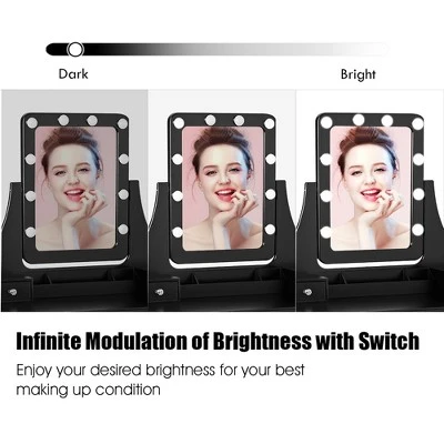 This dressing table has a simple and classic design with 5 large drawers, a detachable slot and a spacious table top to be easy to organize jewelry, cosmetics, perfume, etc. The countertop is made of high-quality MDF material, with its a smooth surface easy to clean. In addition, the mirror is combined with 10 LED lights to light up your beauty. With 360 swivel design, the mirror can be positioned to your desired angle. The stool will provide you with superior comfort and reliable support