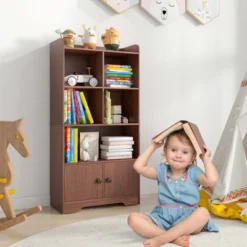 Costway 4-Tier Bookshelf 2-Door Storage Cabinet With4 Cubes Display Shelf For Home Office