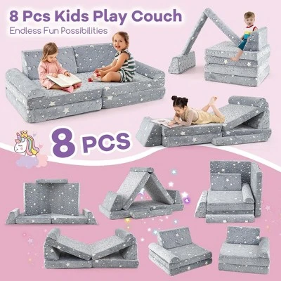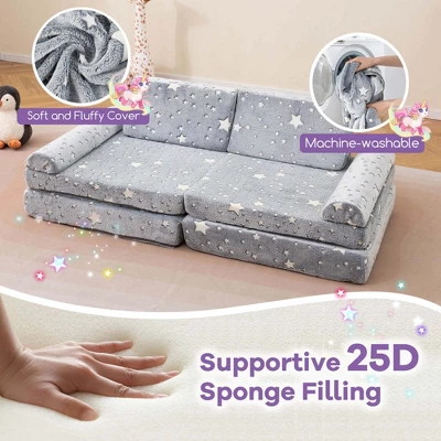 - Gift for Imaginative Play: Comprising 8 separate or connected pieces with handles, the kids’ play couch inspires endless possibilities for fun. Beyond using it as a 2-seater sofa or a floor mat, children can unleash their creativity and imagination by building forts, stages, tunnels, and inventive shapes such as tanks or excavators.