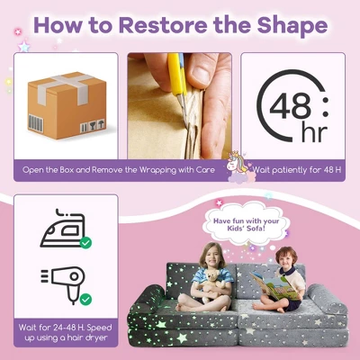 - Ready in 2 Days: Our modular kids play couch comes vacuum sealed, and here’s how you can fully restore its shape and charm: Please remove the wrapping with care and allow 24-48 hours for the foam to rebound. You can also speed up the process and smooth out the remaining wrinkles using a garment steamer or a hairdryer.