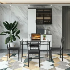 Costway 5 Piece Dining Set Faux Marble Top Table 30” And 4 Padded Seat Chairs W/ Metal Legs