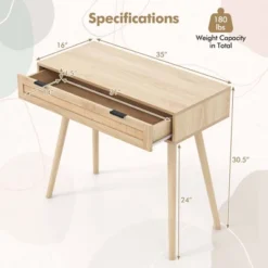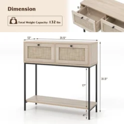 Costway Rattan Console Table With 2 Rattan Drawers & Open Storage Shelf Metal Legs Oak