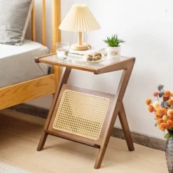 Costway Rattan Side Table Bamboo Accent Bedside Table With Tempered Glass Top Walnut/Natural