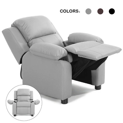 This is our brand new PU leather kids’ sofa, which is designed for safety and comfort. The chair features a headrest, a reclining backrest and an adjustable footrest. Made of iron frame, it’s sturdy and durable for long time use. The adoption of PU leather makes it easy to clean with damp cloth and safe to your children. The backrest and headrest are padded with high density sponge to keep your children safe and comfortable. Other than that, special design of the flip-up armrest allows your child to store snacks, books and cups so that your child can find the items in need within reach. All in all, this cozy kids’ recliner will be a great addition to your living room or your child’s bedroom or playroom. It is a best gift for your children!